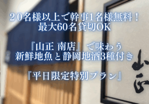 【沼津 忘年会】20名様以上で幹事1名様無料!最大60名貸切OK『山正 南店』で味わう新鮮地魚と静岡地酒3種付き平日限定特別プラン