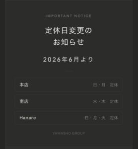 2026年6月より、各店舗の定休日を下記のとおり変更させていただきます。